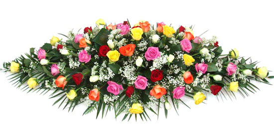 A mixed funeral flower arrangement that can be placed on top of a coffin or in the church.